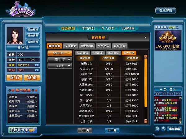 目前欢乐谷开放的游戏种类繁多,当然不可或缺的就是麻将及扑克游戏,内容包含多人对战类的台湾 16 张麻将,德州扑克,牛牛,捡红点等种类。单机休闲类的部分,则包含水果盘,三国杀拉霸,皇冠列车,满贯大亨,5PK等。除此之外,游戏内还有特殊的任务成就系统,玩家可以透过达成任务条件之后,获得一定的红利与虚宝回馈。除了上述的游戏特色之外,《欢乐谷 Online》将定期举办各项赛事活动,让玩家在玩游戏的过程当中,可以获得竞赛的刺激感,并且可以获得更多乐趣,绝对让玩家朋友们爱不释手。