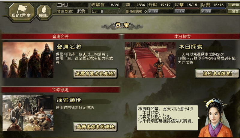 透过《百万人的三国志Special》游戏中的“登庸系统”,拥有多元的武将招募管道,将协助玩家顺利推展,取得更多的领地。玩家不但可透过使用“金币”招募高等武将外,还可透过“本日探索”、“领地探索”等不耗费资源的模式,即可招募更勇猛的武将,协助玩家顺利闯关,占领更多的领土。