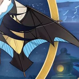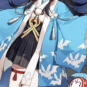 这款皮肤整体以蓝色、黑色为主、白色为辅,配色活泼灵动。吸血姬身着蓝色印花短浴衣,内搭和服短百褶裙,黑色长发有蝠翼头饰装饰,头上斜戴狐面,右手执圆扇,左手拎风筝,身旁围绕三个形态各异的达摩,灵动飘逸!