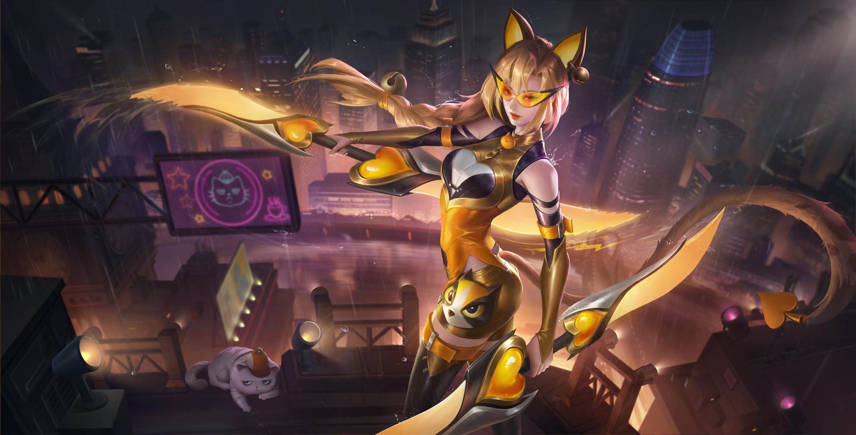 武器设计为双刃弯刀,并在手柄位置加入了两颗爱心元素,在耳朵和鞋子的位置添加了铃铛元素,性感又不失可爱。